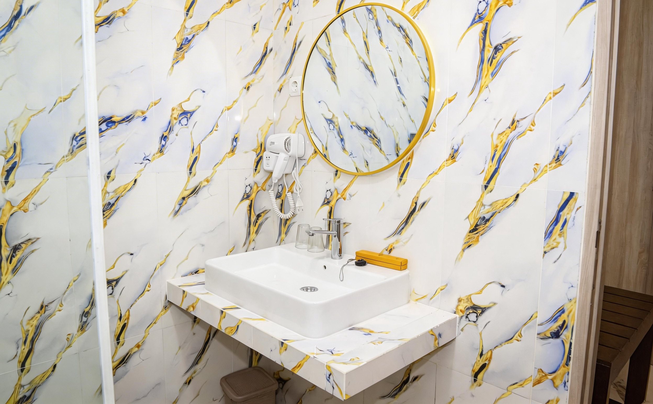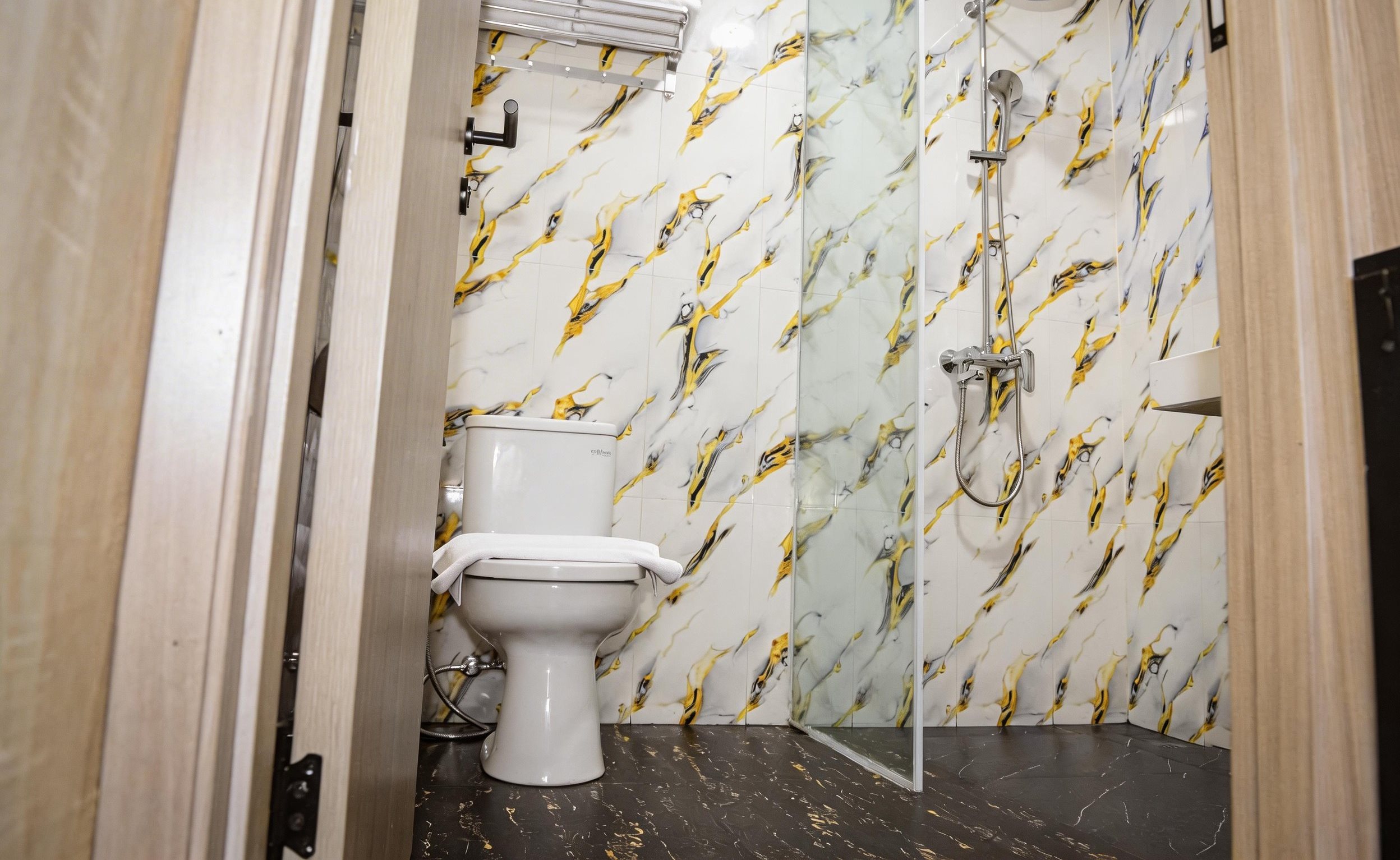 Kamar mandi modern hadir dengan fasilitas lengkap, mulai dari hot & cold shower, wastafel, cermin, hingga perlengkapan mandi seperti handuk, body wash, shampoo, dan hairdryer, memberikan kenyamanan seperti di rumah sendiri.